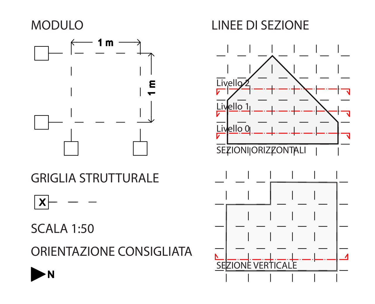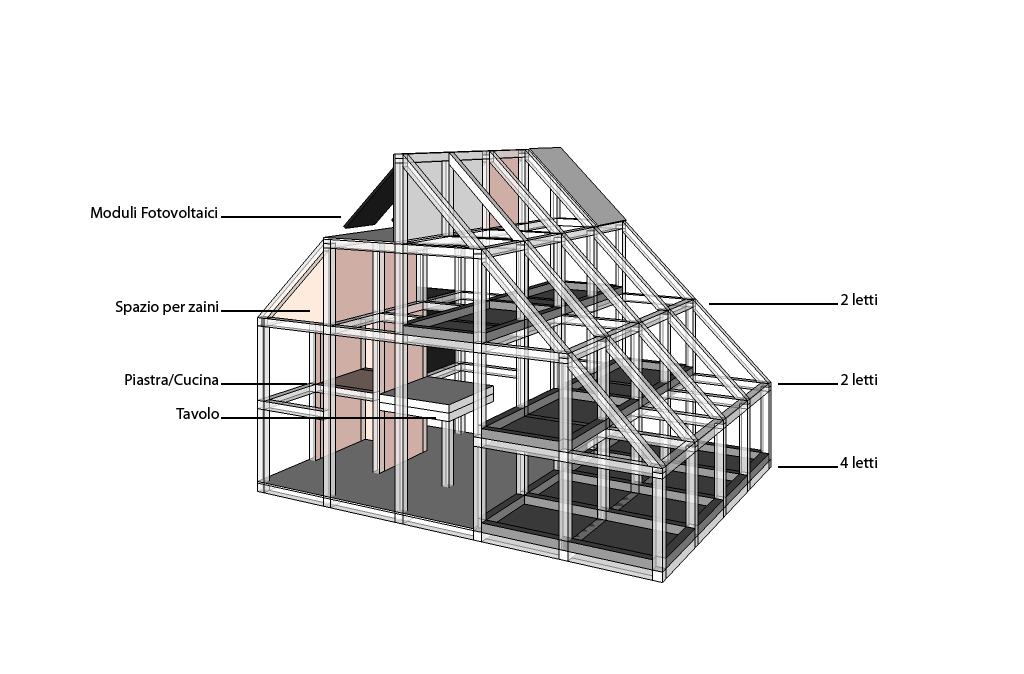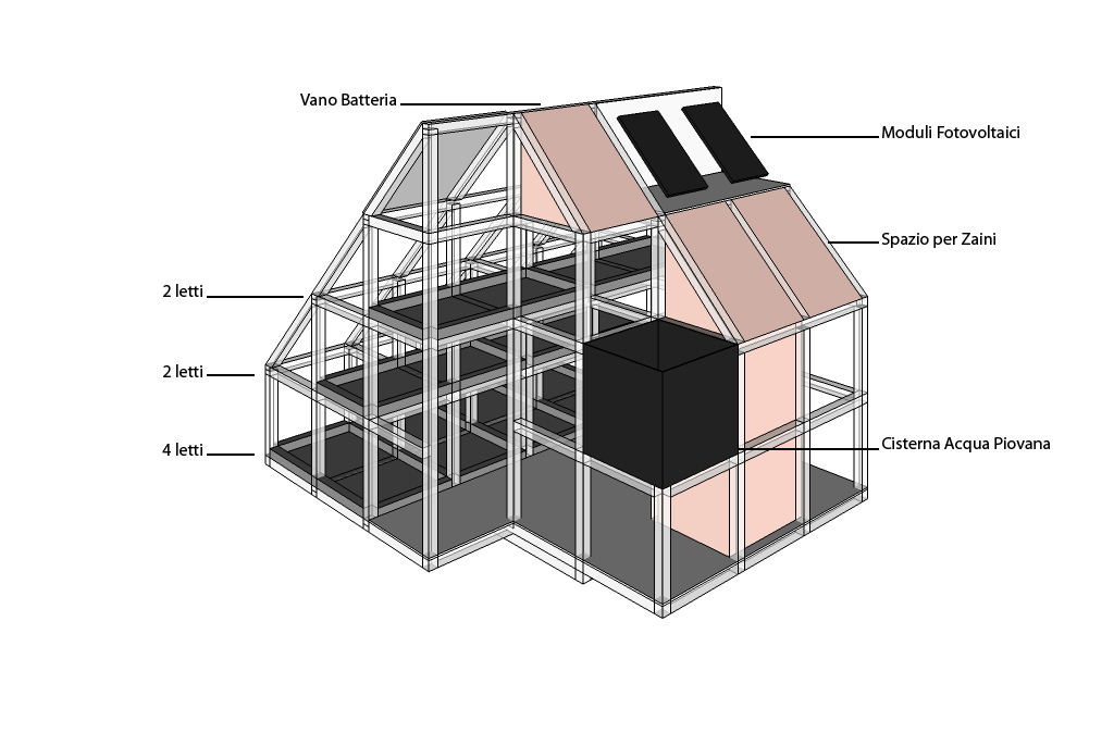 El refugio puede dar hospedaje a hasta 8 excursionistas a la vez en solo 45 m3. La estructura, de madera, es totalmente desmontable, modulada según cubos de 1 m de lado, que son la base de la estructura portante. La autosuficiencia energética está garantizada por la presencia de 2 m2 de paneles fotovoltaicos que generan energía suficiente para activar las 4 lámparas LED y las lámparas alógenas de la cocineta. Se prevé una cisterna de 1 m3 para una reserva minima de agua. Se prefiere la instalación del refugio cerca de ríos o espejos de agua.
