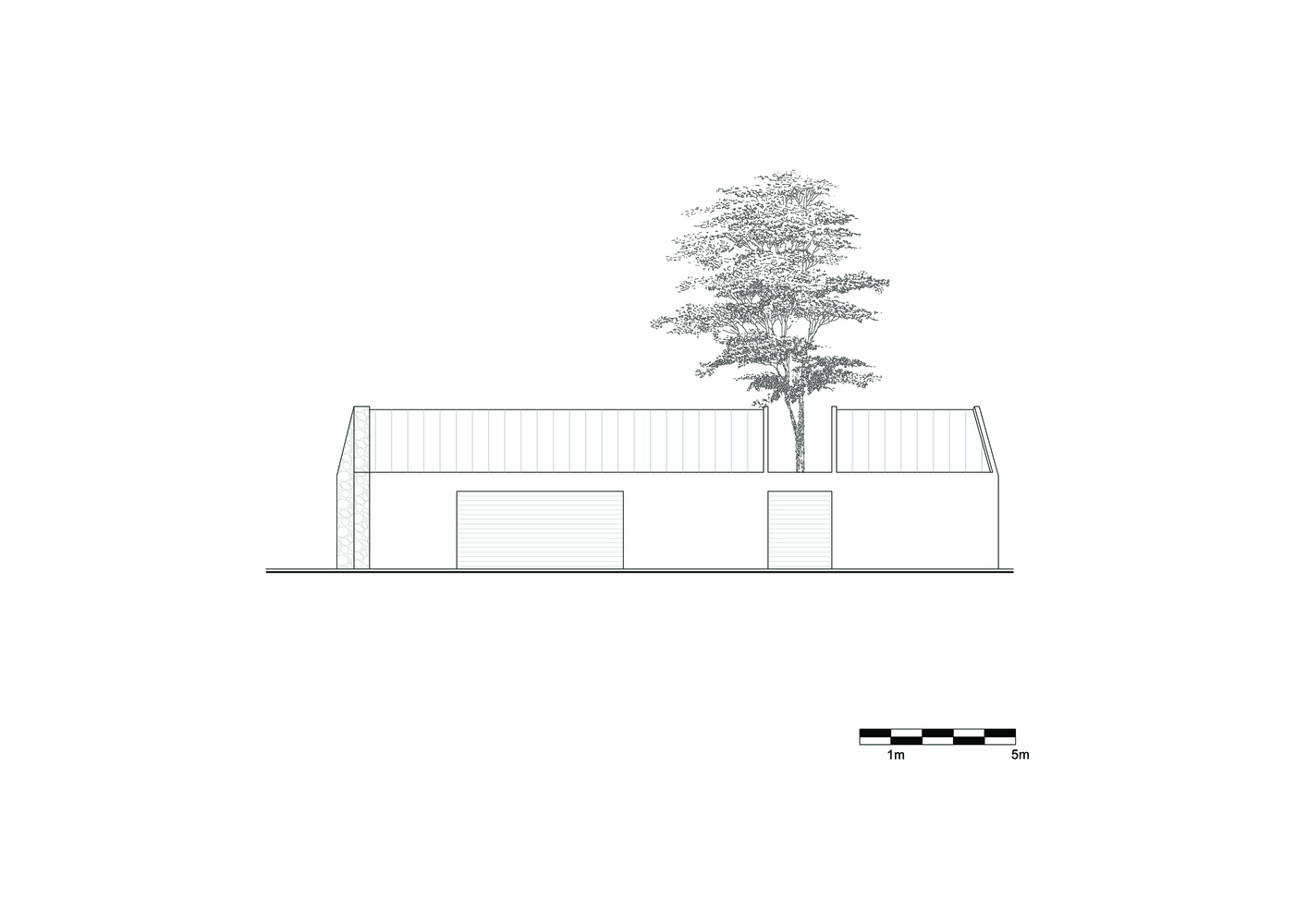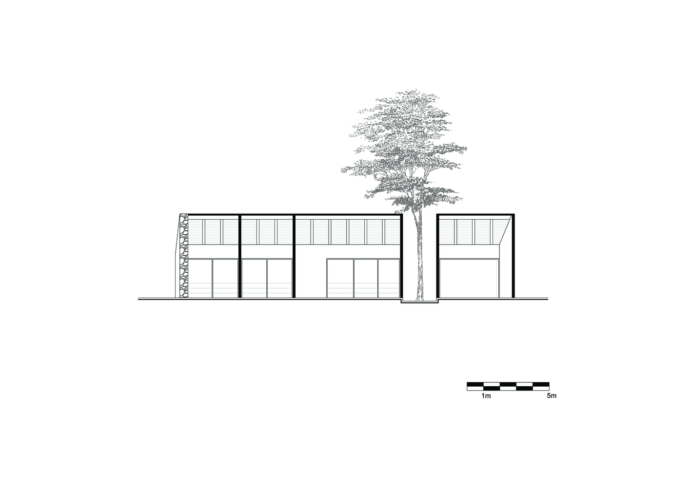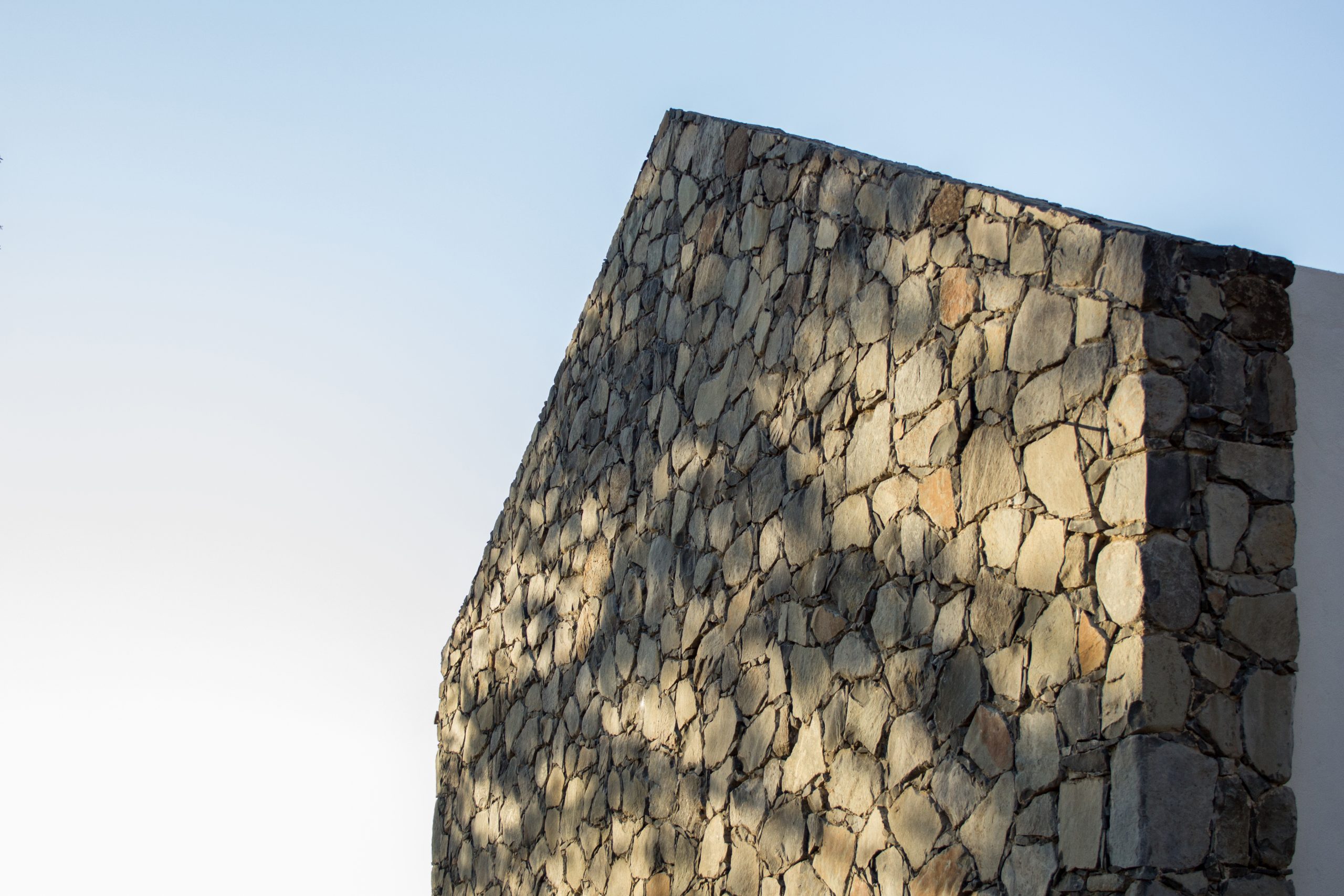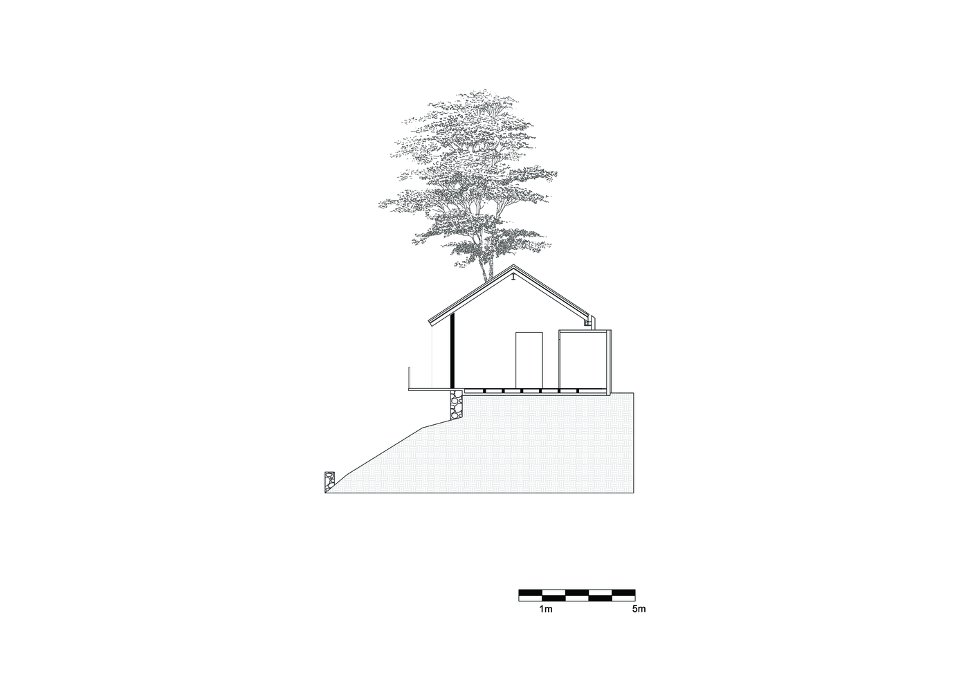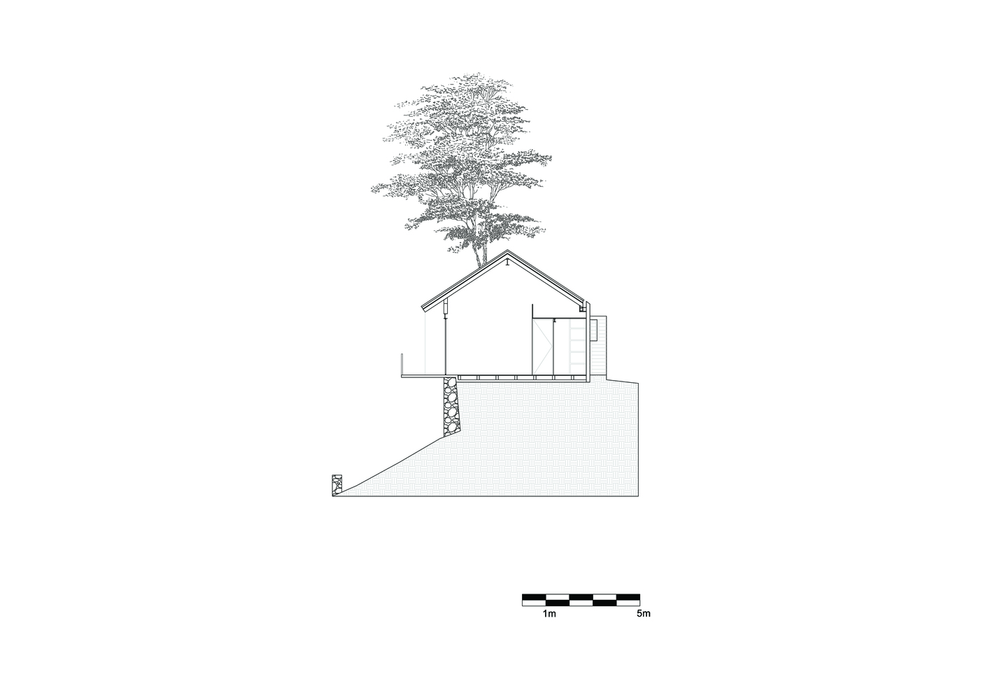 Una casa lineal introvertida de 6 metros de ancho por 20 metros de largo que se cierra hacia la calle y a sus vecinos contiguos, pero que se abre completamente hacia el paisaje por medio de una terraza en voladizo a todo lo largo de la casa. Aprovechando los elementos naturales del sitio se plantean muros de piedra que confinan el proyecto y dan la bienvenida desde la calle. El ingreso principal es una puerta de madera solida de 2 metros de ancho por 3 metros de alto que ocupa las mismas dimensiones espaciales del vacío generado por el pino, que al abrirse remata con el mismo. La cubierta se plantea a dos aguas evocando la geometría de las casas tradicionales de la región, la cual se trunca generando un vacío y una fragmentación para contener el pino. Dicha geometría nos ayuda para que la casa gane en volumen y poder generar espacios medianeros en sección.
