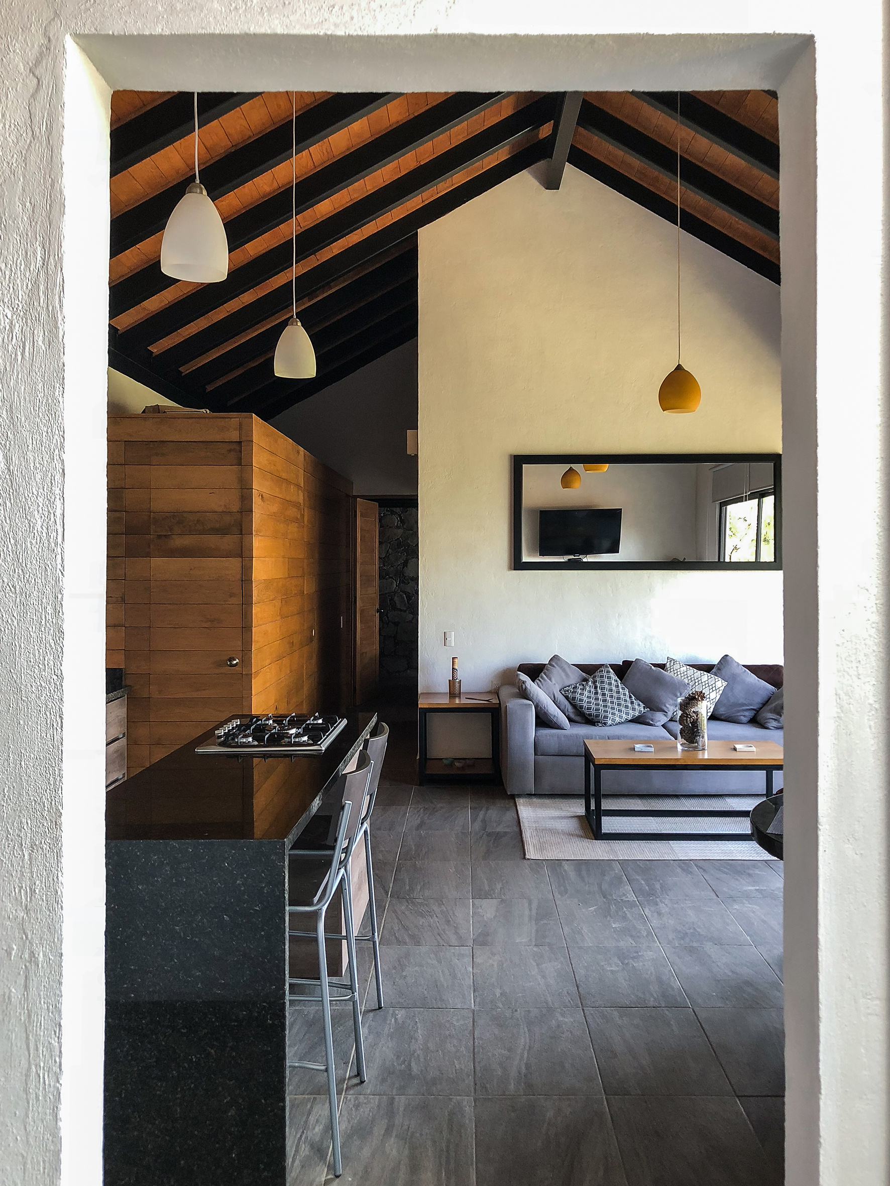 A partir de la división espacial generada por la ubicación natural del pino la casa se divide en 2 áreas, una hacia el oriente donde se ubica la habitación principal con baño y vestidor separada del resto de la casa, y otra hacia el poniente donde se localizan las áreas públicas, dos habitaciones y una caja o volumen de madera que contiene las areas húmedas (lavandería, medio baño y baño completo) que rompe con la linealidad continua del proyecto tanto al interior como al exterior.
