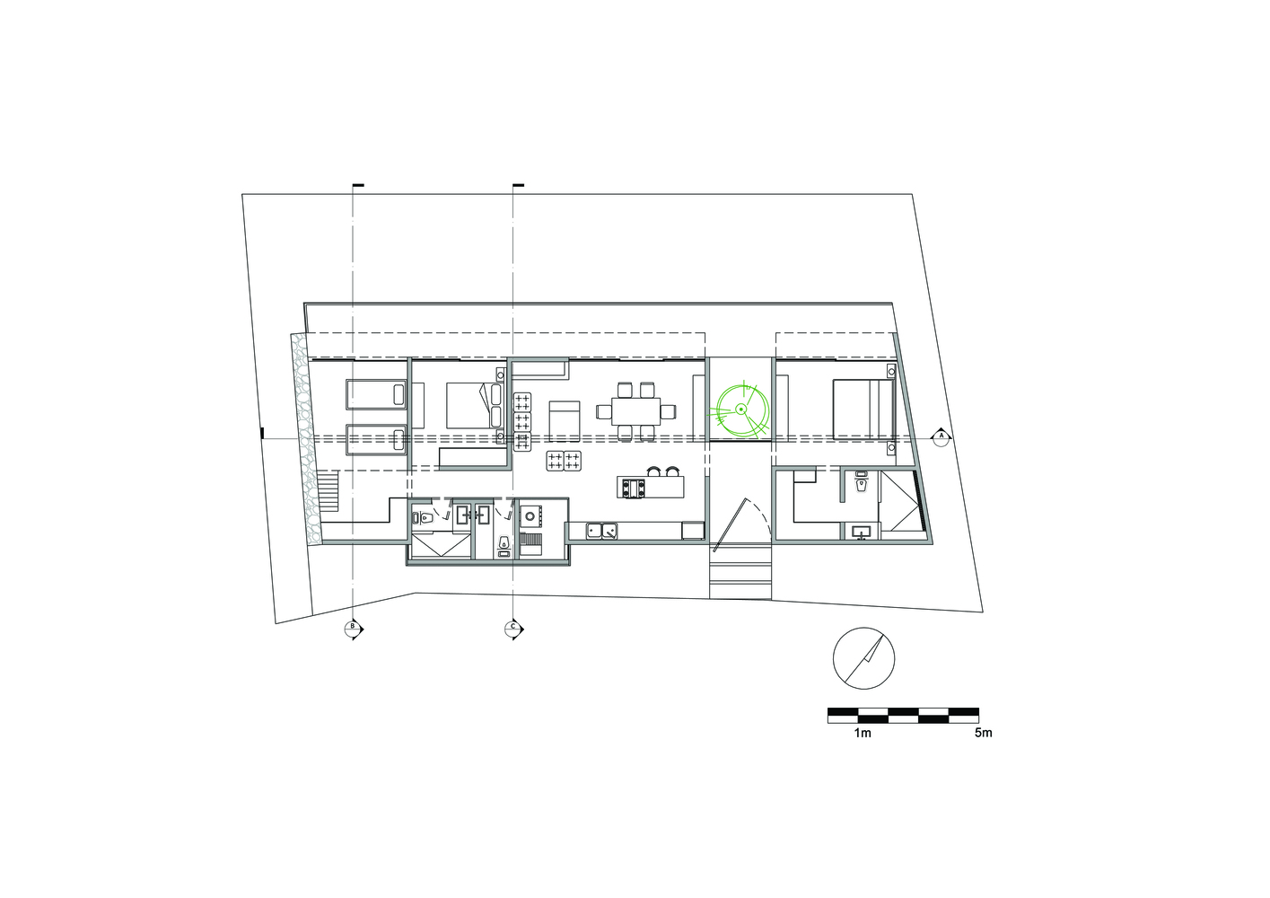 La casa se ubica en la sierra de Mazamitla en un terreno estrecho con una pendiente considerable cuya particularidad es un pino de mediana edad como elemento protagónico. El proyecto nace a través de respetar el pino como pieza articuladora de la casa.