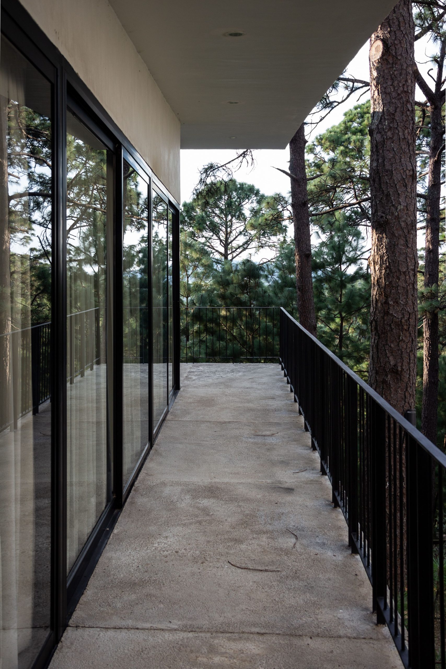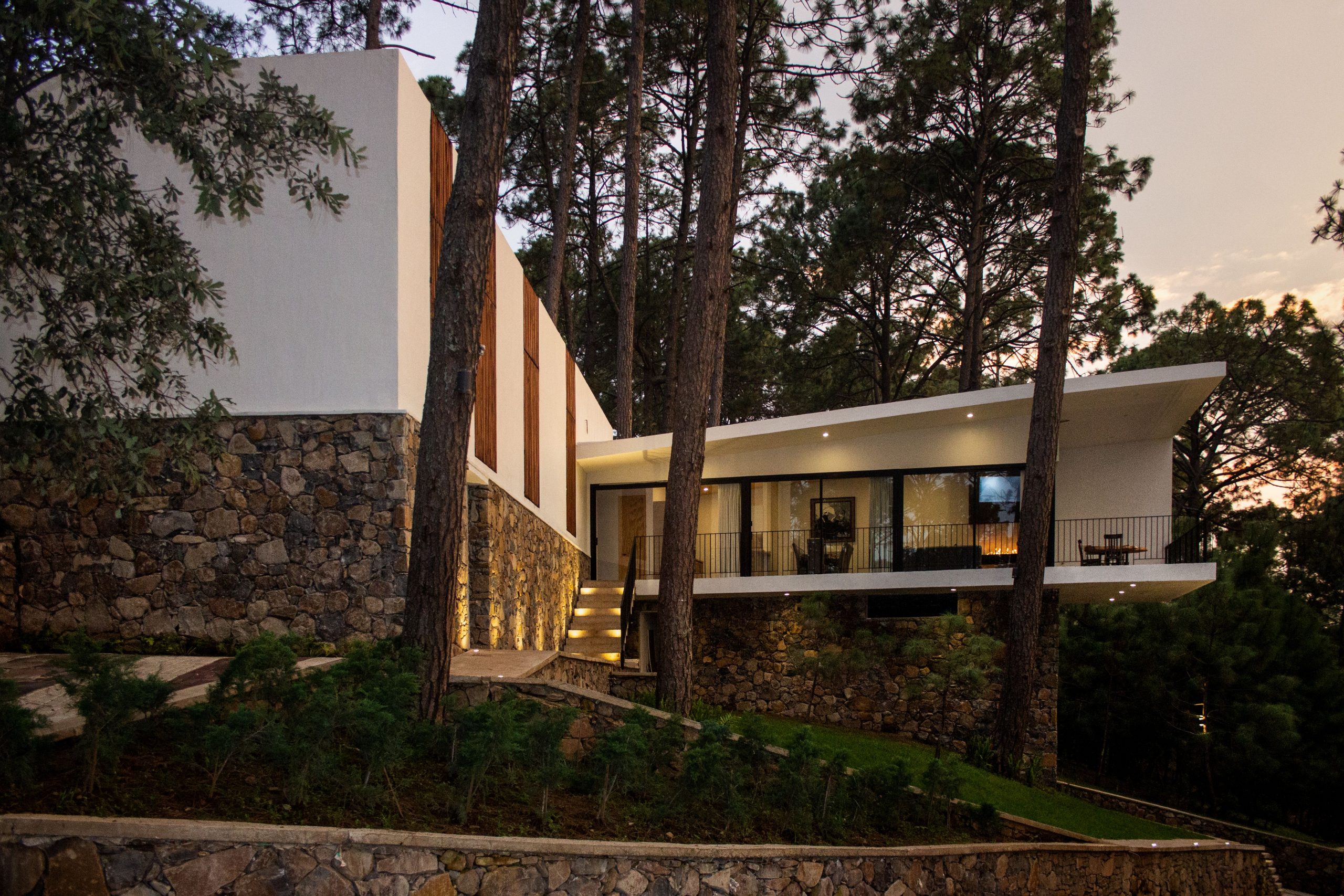 El proyecto se plantea a través de dos volúmenes en desniveles que se adaptan a la topografía del sitio, respetando todo el arbolado existente y abrazando un espacio verde cohabitado por tres pinos de gran altura. El planteamiento del proyecto es encontrarse con las distintas vistas y atardeceres que la naturaleza nos ofrece.