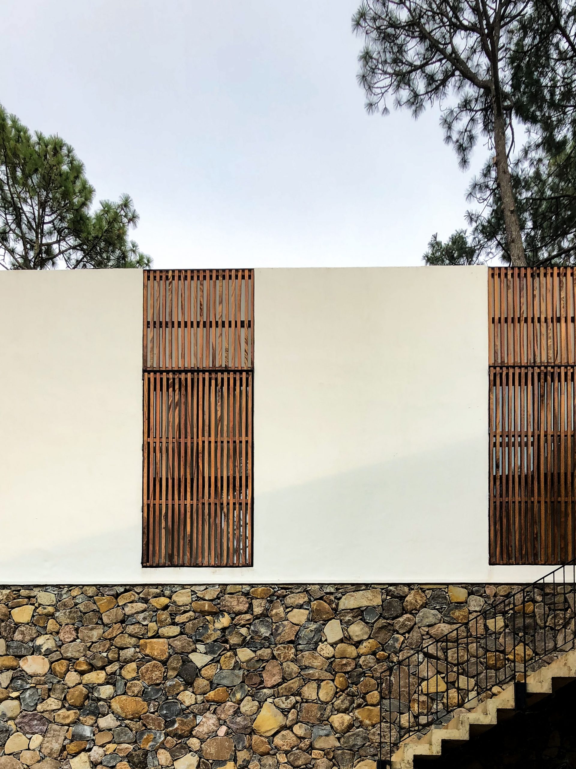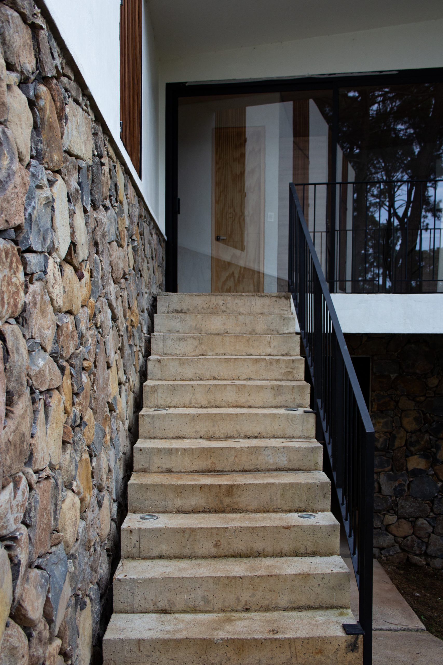 En la parte inferior de este volumen en voladizo soportado por muros de piedra, se encuentra un espacio social con una cava, en relación directa con el espacio verde central cuyo acceso es a través de los andadores y escaleras exteriores. Uno de losretos del proyecto era poder conectar todo el programa de manera accesible por medio de rampas y andadores desde el punto más bajo del estacionamiento hasta el punto más alto del ingreso principal.