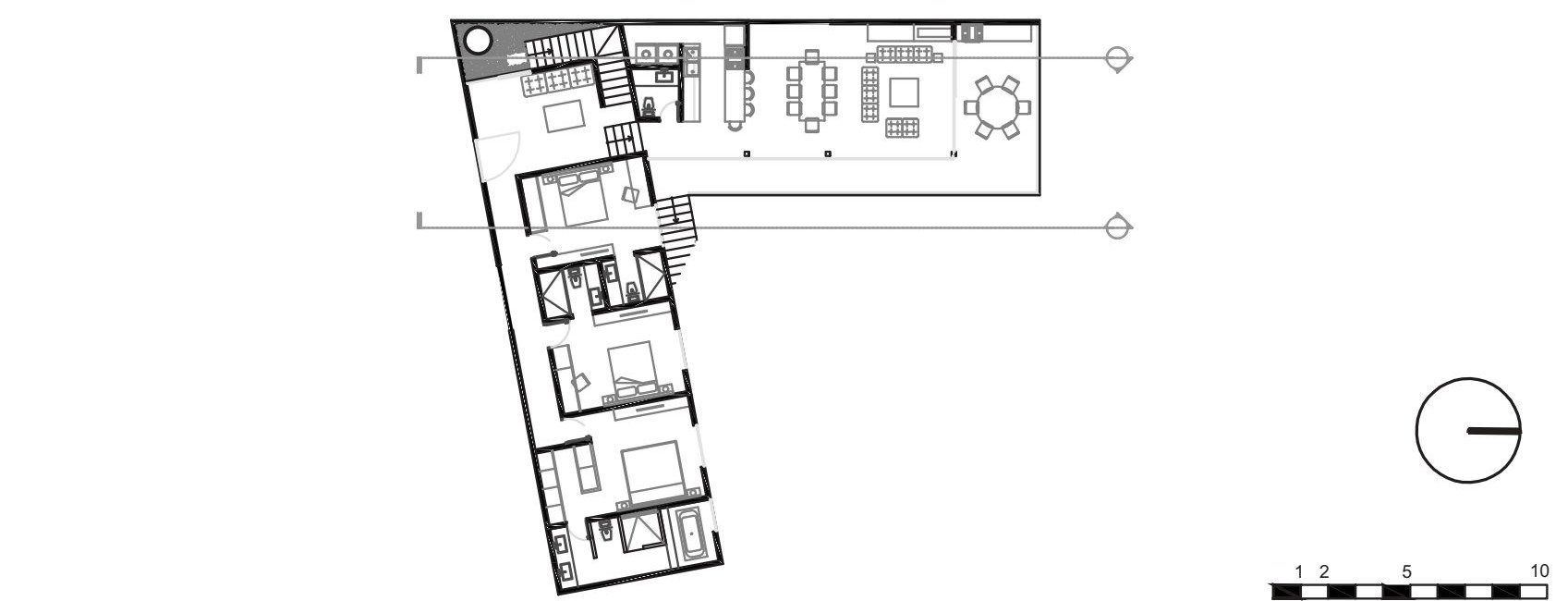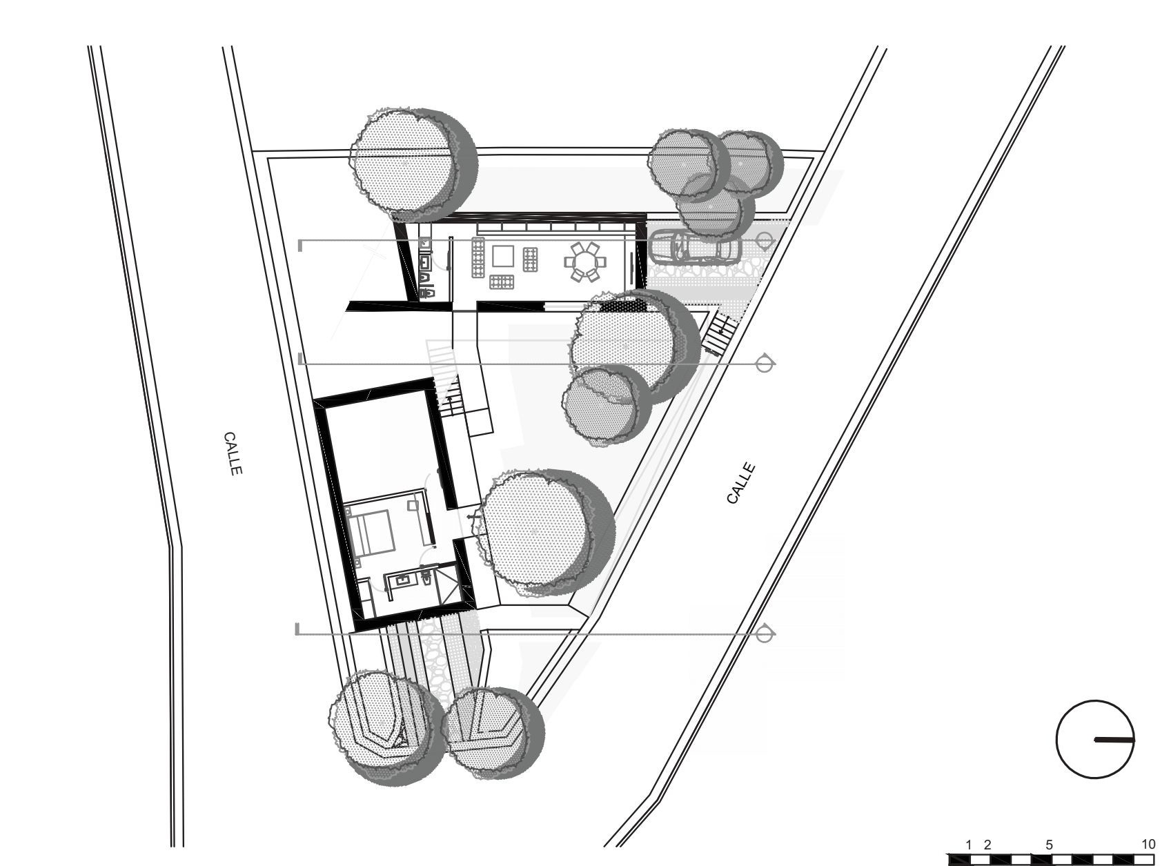 Un volumen cerrado hacia la calle superior ubicado sobre un basamento de piedra, contiene el ingreso principal , un patio y las tres habitaciones dejando a su vez un espacio inferior para una habitación de visitantes que se accede desde los andadores y plazoleta exterior. Un segundo volumen nace desde el nivel de la calle superior y termina volando sobre la calle inferior, albergando las areas de estar y una serie de terrazas que miran hacia el bosque y nos acercan a la copa de los pinos.