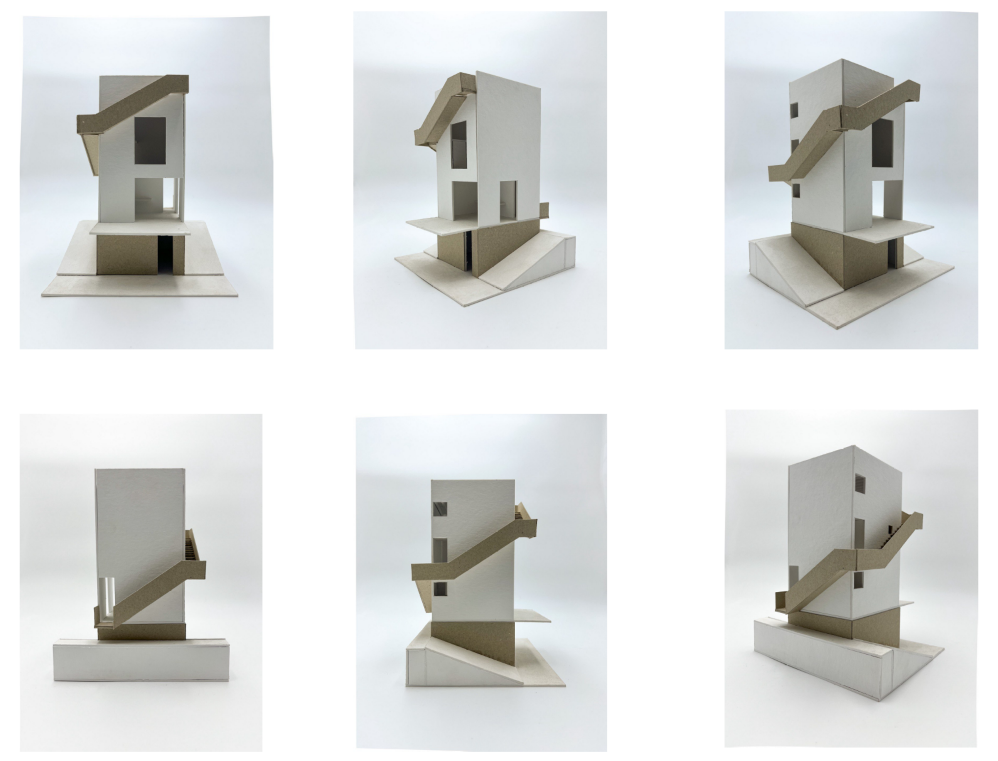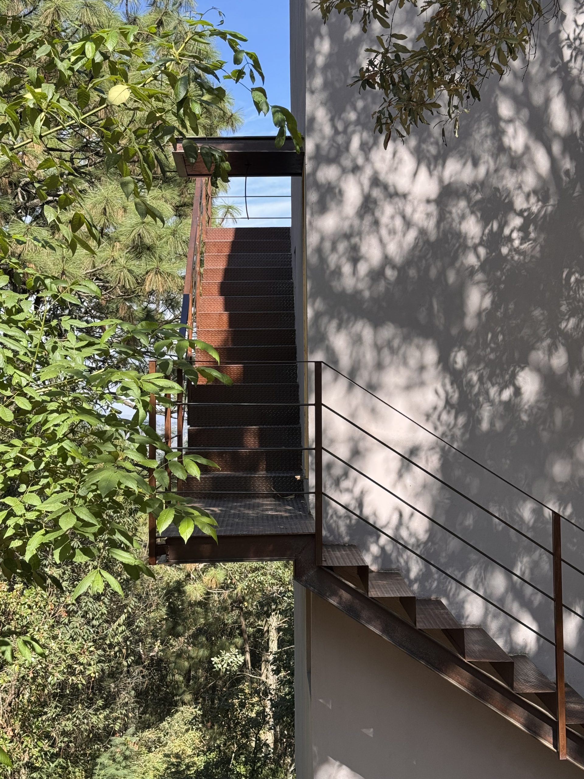 La escalera, concebida como una espiral que abraza los volúmenes, se despliega por fuera de los habitáculos, recorriendo tres de sus lados. Este elemento escultórico y funcional se convierte en uno de los protagonistas del proyecto, conectando los niveles mientras enmarca vistas cambiantes del bosque.