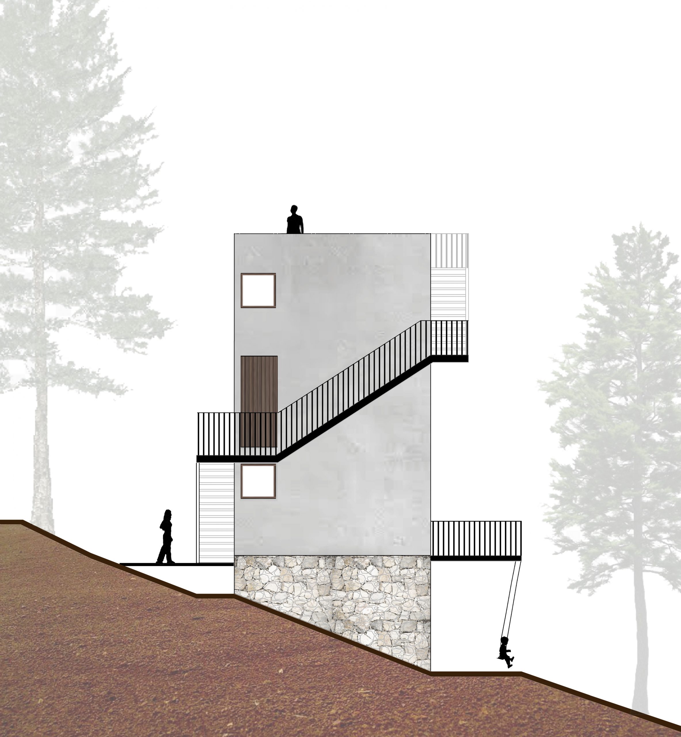 En el basamento de piedra, la planta menos uno, se encuentran los servicios y la cisterna; la planta cero, de ingreso, debajo de la copa de los pinos, alberga una cocina, un espacio diáfano, un baño completo y una terraza abierta al paisaje inmediato; en la planta uno, a la altura del follaje de los pinos, se encuentra una habitación con baño y un mezanine; en la planta dos, por encima del follaje de los pinos, se encuentra una terraza abierta, un mirador que se abre hacia el valle, ofreciendo una experiencia panorámica.
