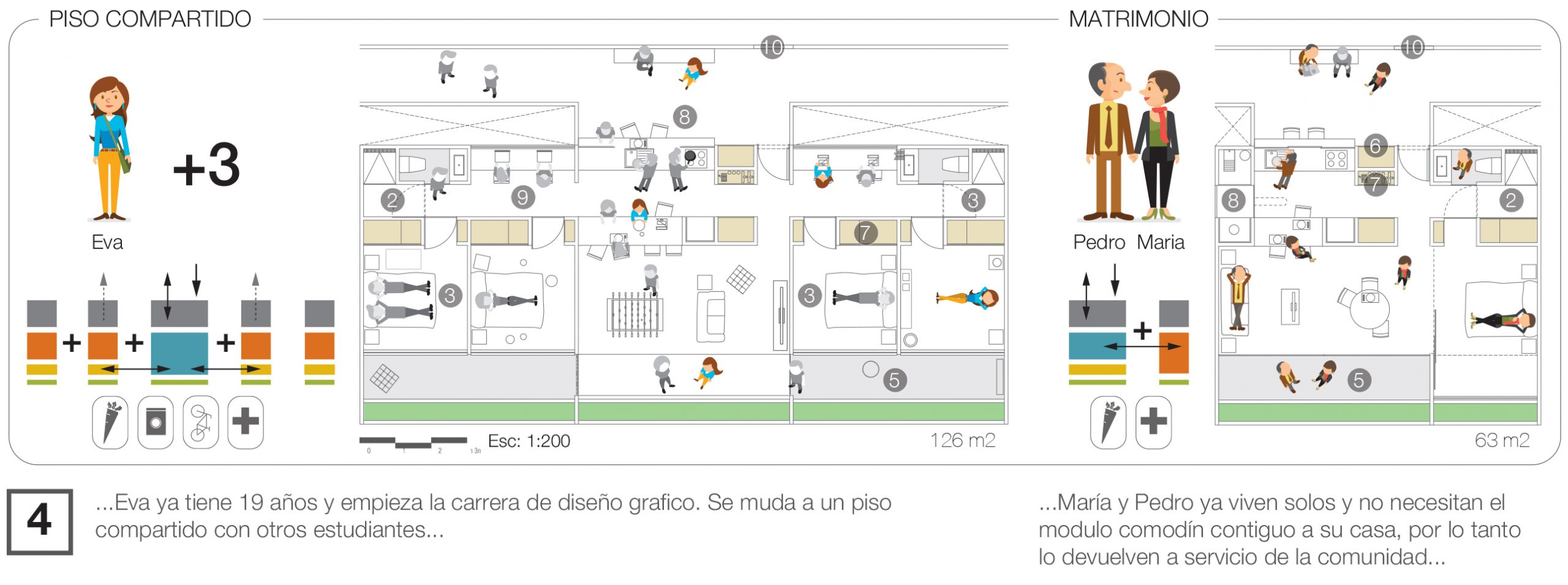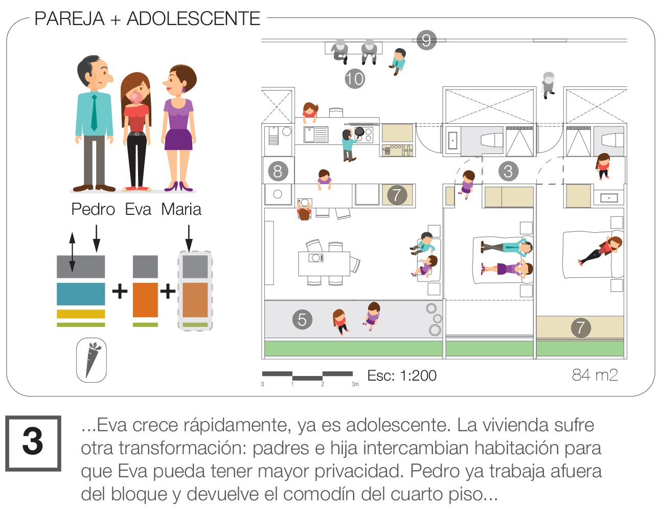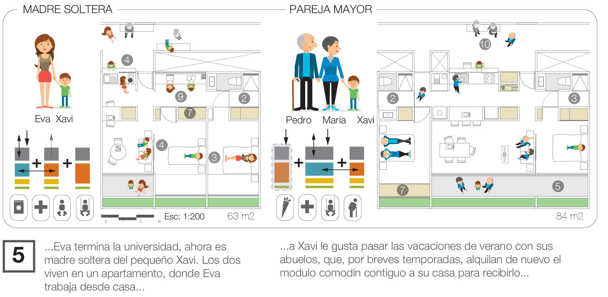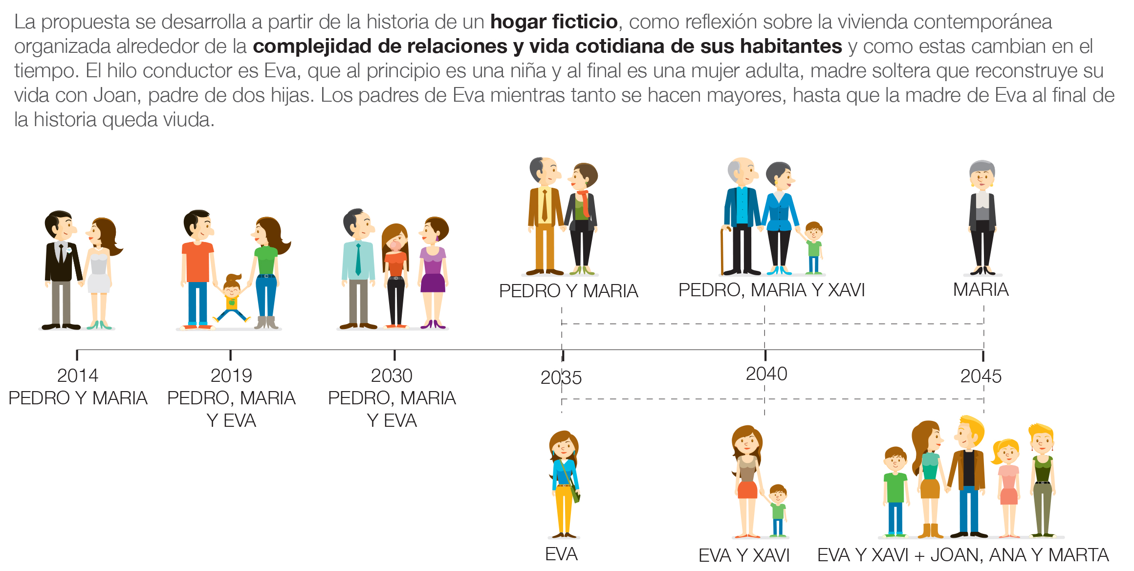 En terminos narrativos, la propuesta reflexiona sobre la vivienda contemporánea a través de la historia de Eva y los cambios de su hogar a lo largo de 30 años. Este hilo narrativo enfatiza cómo las viviendas propuestas son capaces de adaptarse a los cambios en las dinámicas familiares a lo largo del tiempo.