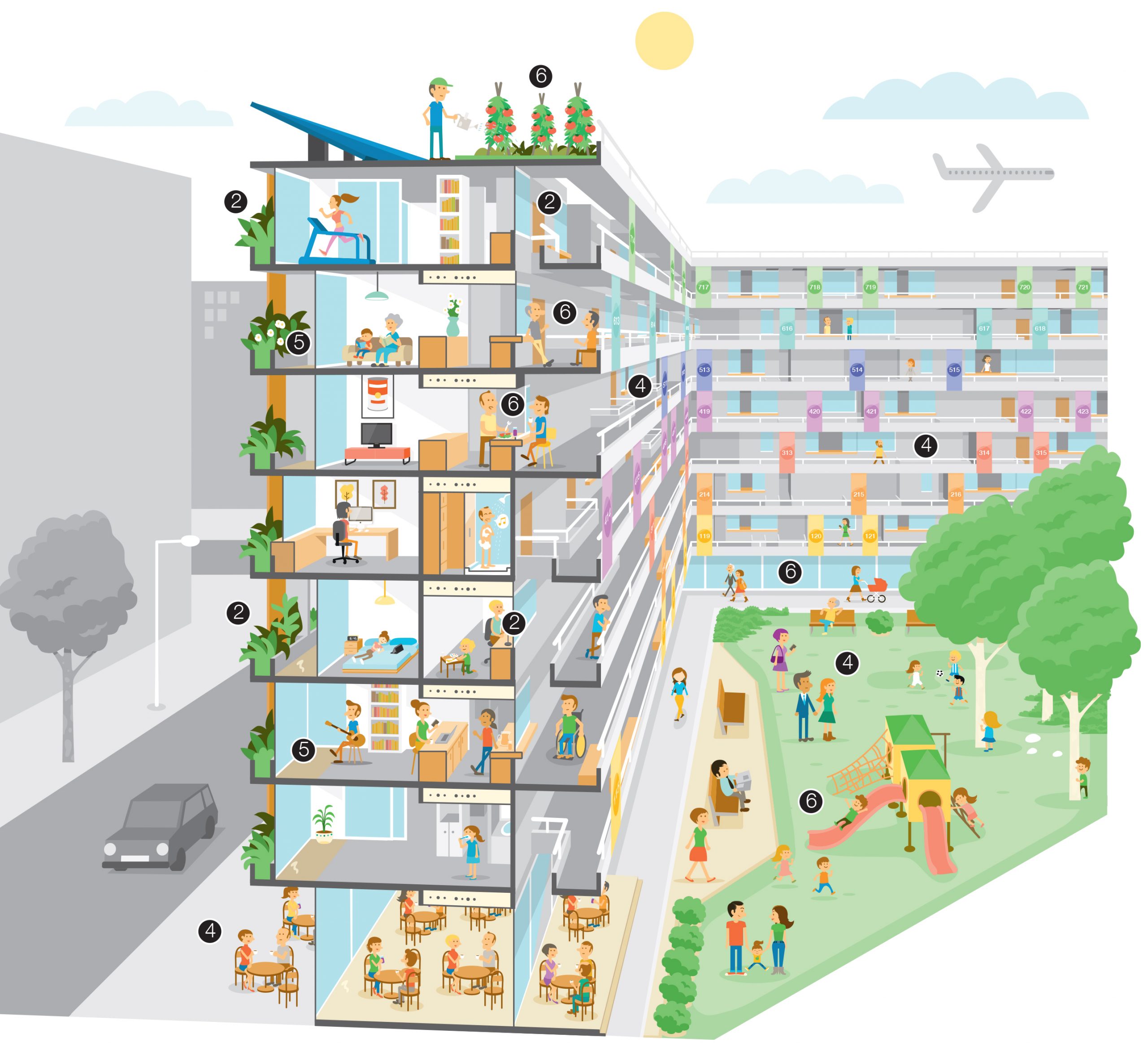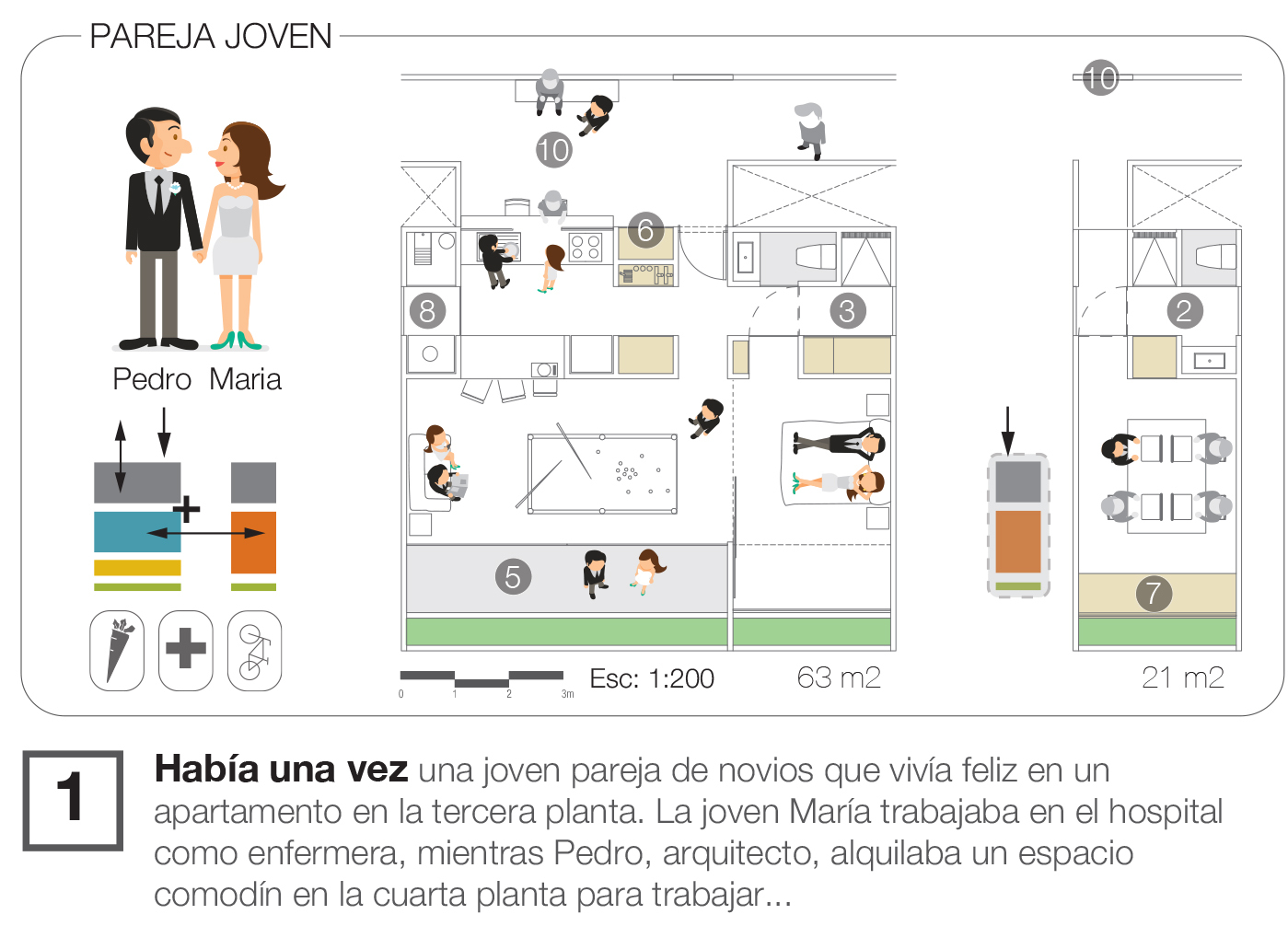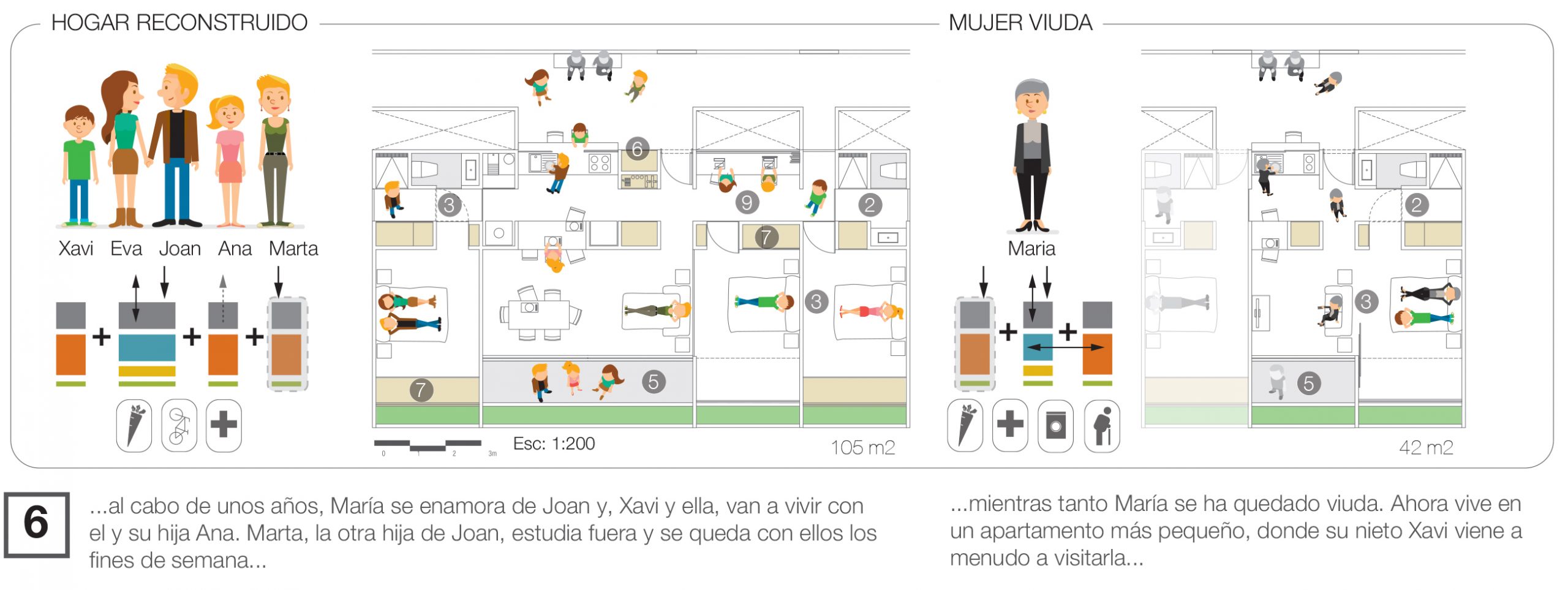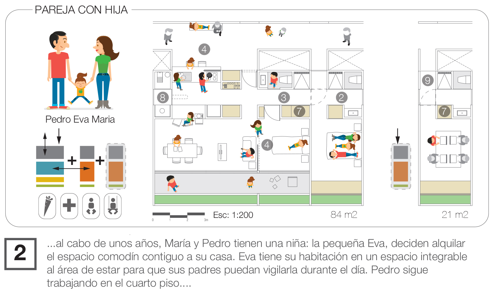 En terminos narrativos, la propuesta reflexiona sobre la vivienda contemporánea a través de la historia de Eva y los cambios de su hogar a lo largo de 30 años. Este hilo narrativo enfatiza cómo las viviendas propuestas son capaces de adaptarse a los cambios en las dinámicas familiares a lo largo del tiempo.
