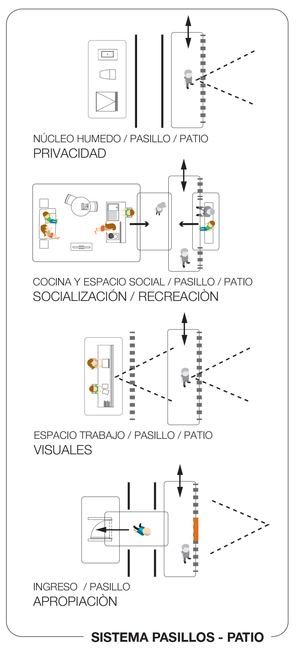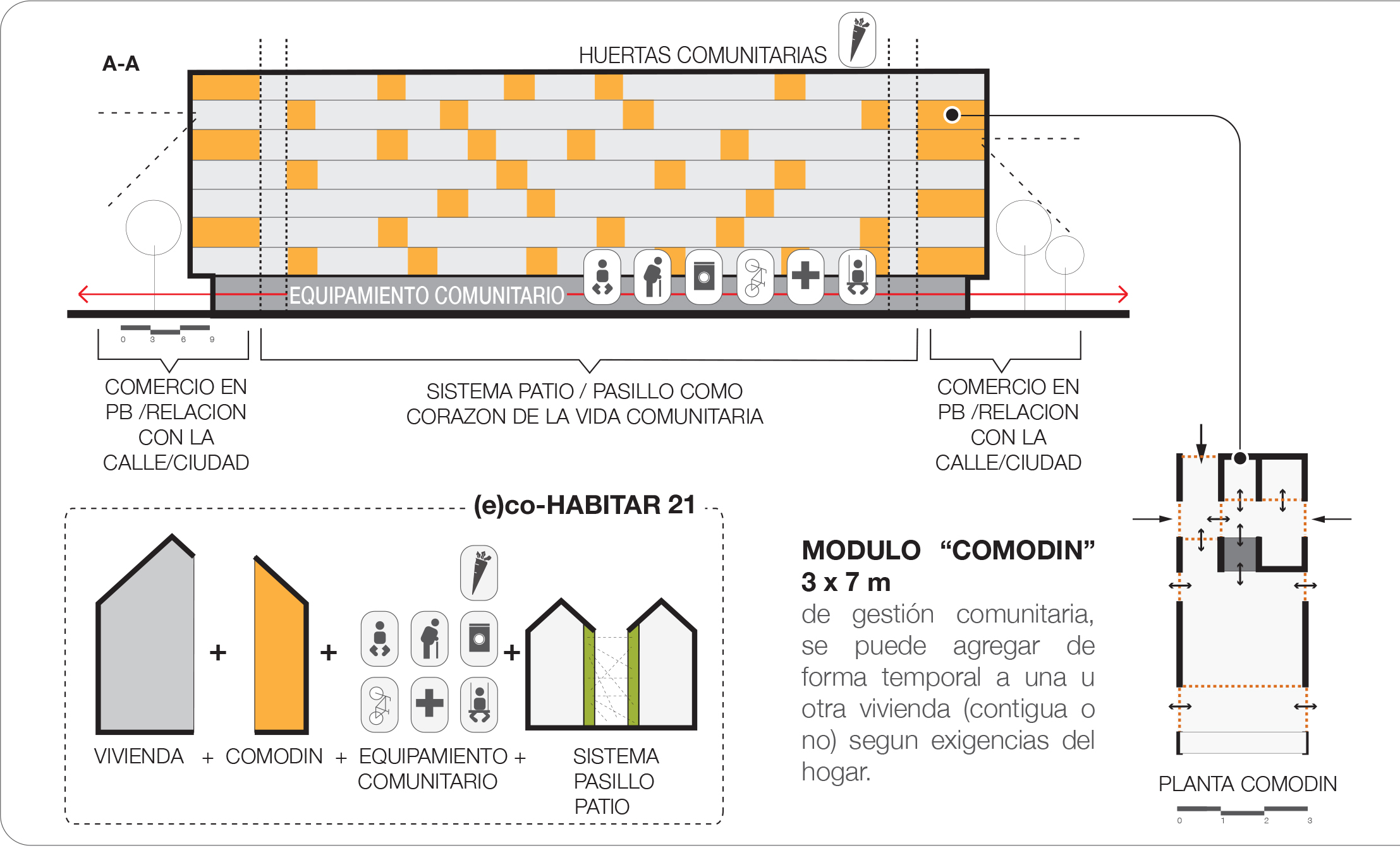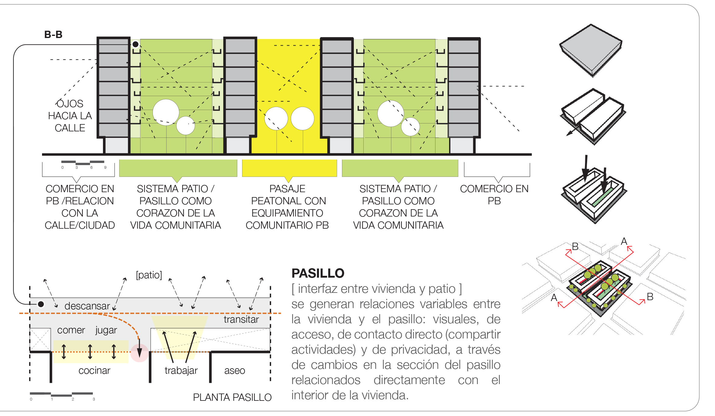 Las viviendas están pensadas para agregarse de forma ideal alrededor de un patio central, conectándose por medio de pasillos comunitarios, que están concebidos como espacios de relación, filtro entre el interior y el exterior, promoviendo interacciones vecinales y sirviendo como el núcleo de la vida comunitaria. El sistema pasillos-patio se configura así como el gran corazón del bloque, centro de la vida comunitaria. Por otro lado, todas las viviendas tendrán relación directa con la ciudad por medio de su fachada principal, la cual se abre hacia el espacio público y la calle a través de ventanas y del espacio exterior privado de cada vivienda, como “ojos” a la ciudad. La introducción de un pasaje central peatonal con usos mixtos que atraviesa la manzana, permite reforzar la presencia de comercio y equipamiento comunitario en planta baja, promoviendo relaciones de proximidad y un entorno urbano dinámico.