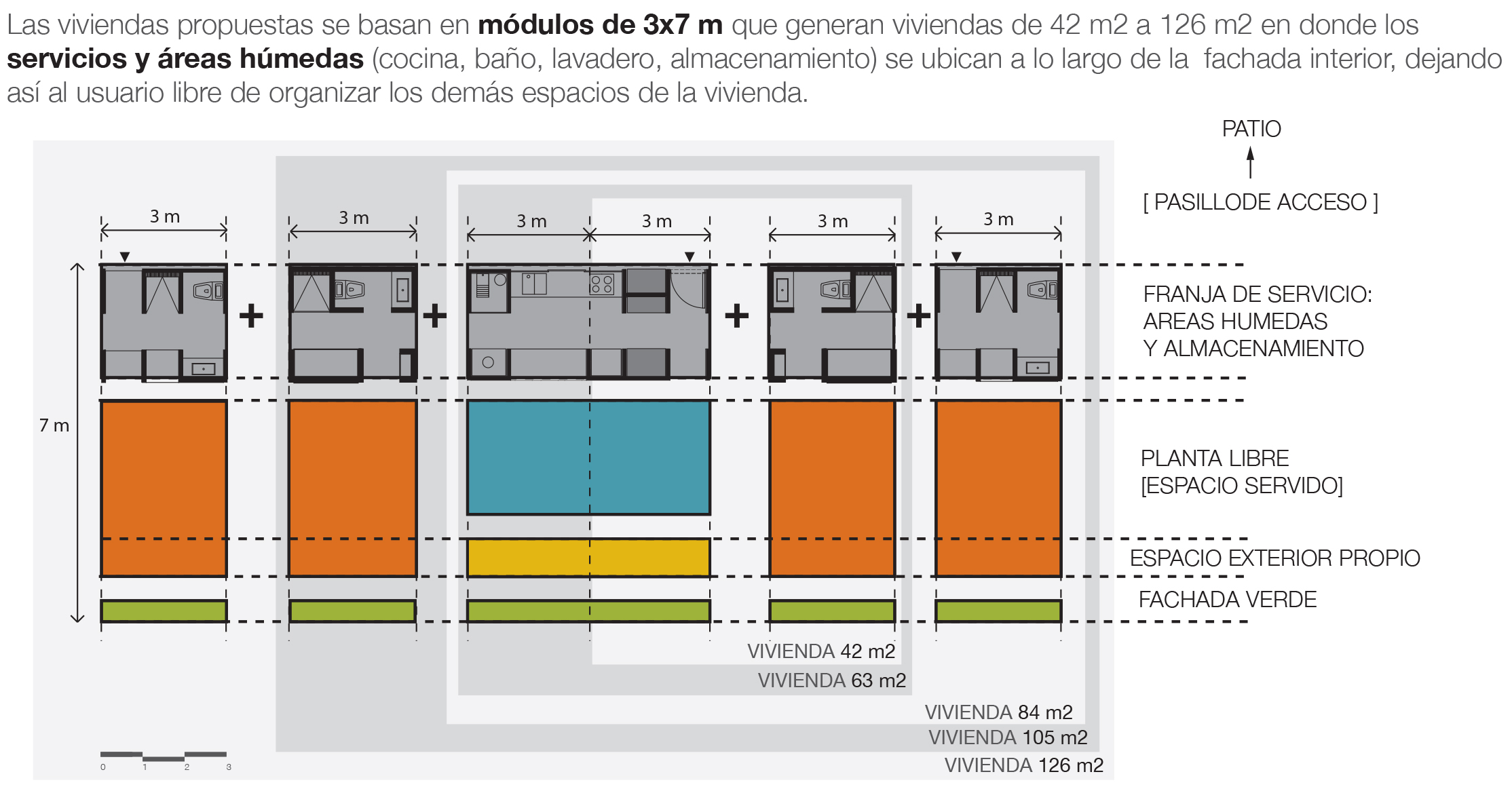 Las viviendas propuestas se basan en módulos de 3×7 m, con superficies entre 42 m2 y 126 m2, con una distribución flexible que permite personalizar los espacios interiores, mientras servicios y áreas húmedas (cocina, baño, lavadero, almacenamiento) permanecen fijos en la fachada interior.